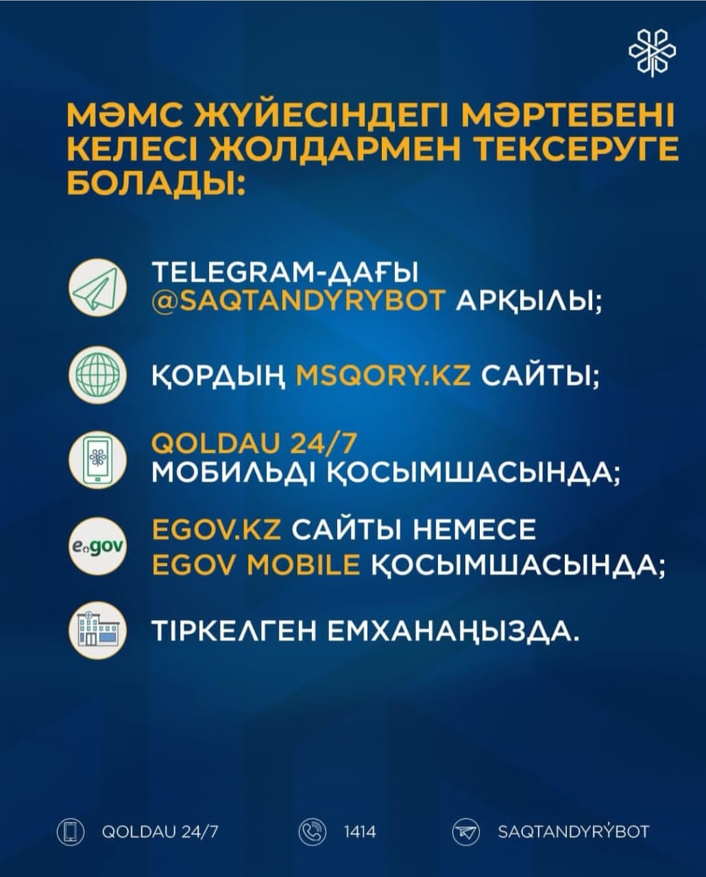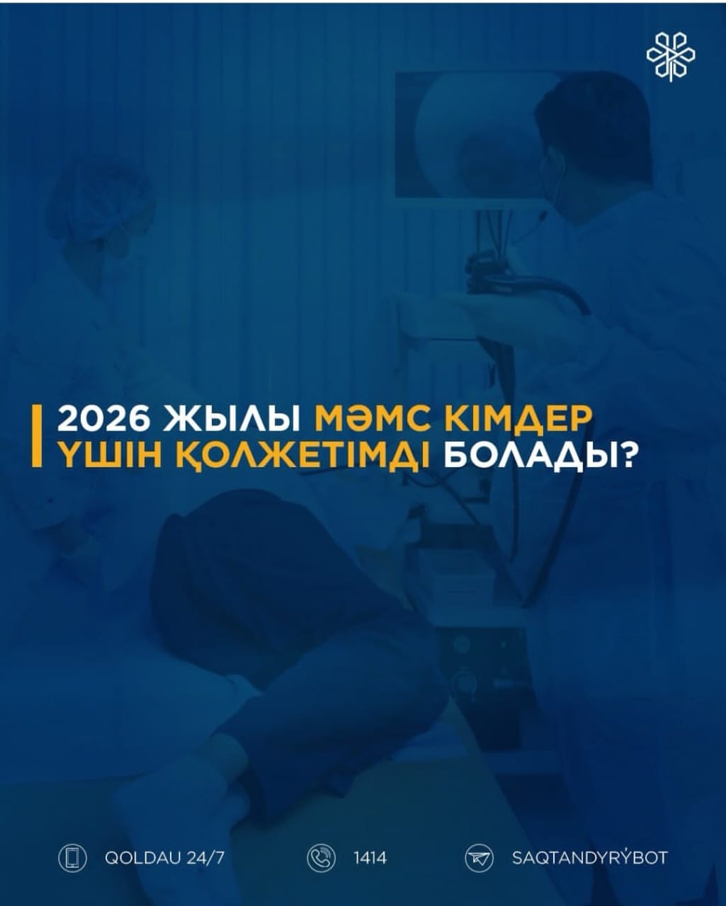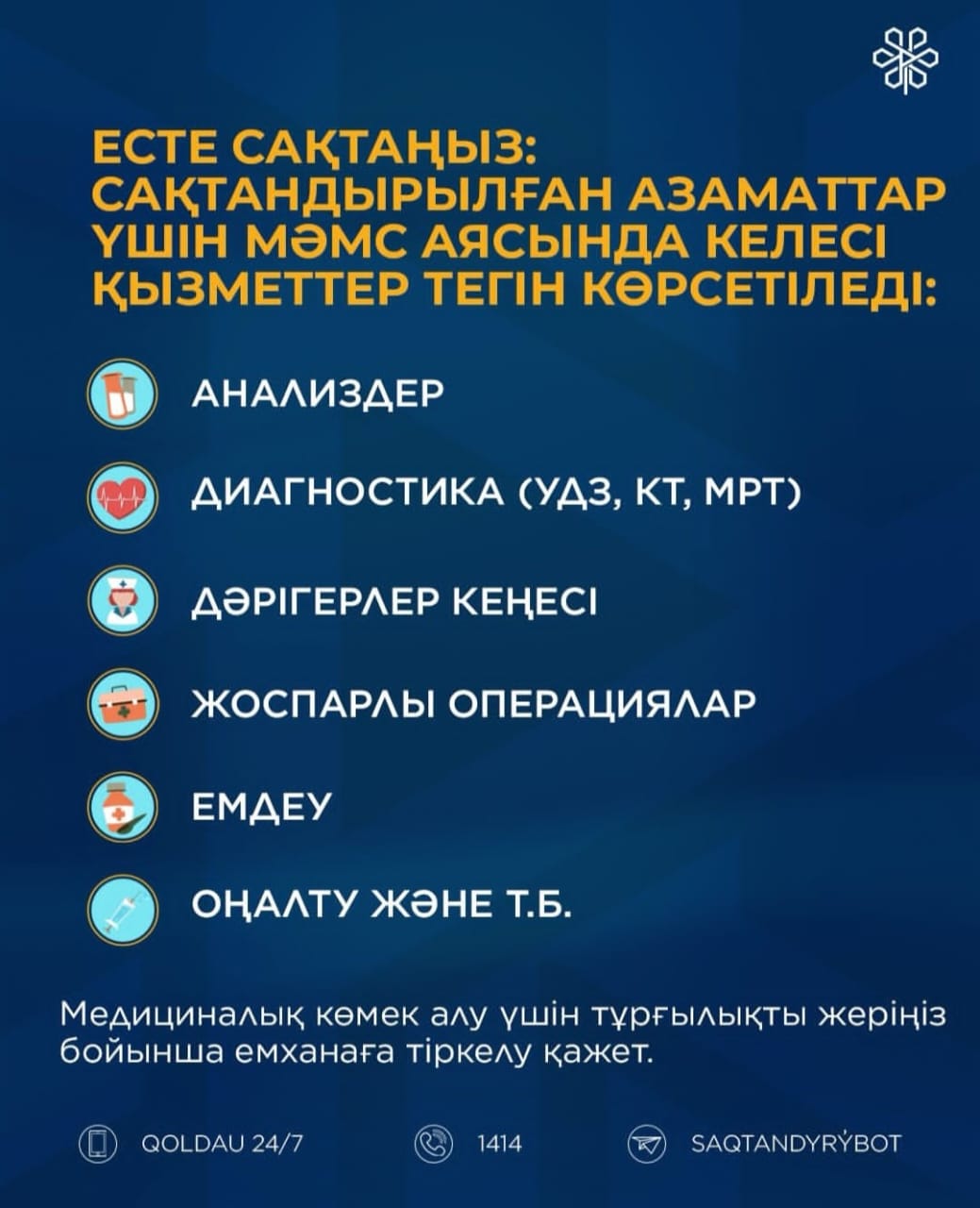 ❗Сақтандырылған азаматтар үшін диагностика, дәрігерлердің кеңесі, жоспарлы операциялар, емдеу және оңалту қызметтері МӘМС аясында тегін көрсетілетінін есте сақтаңыздар. Медициналық көмек алу үшін тұрғылықты жеріңіз бойынша емханаға тіркелу қажет.