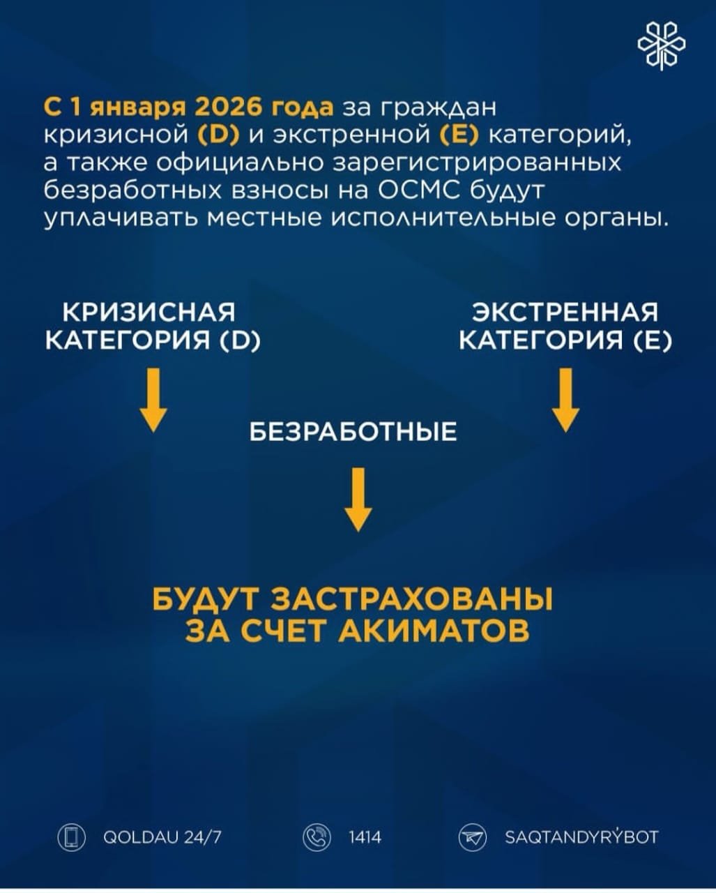 С 1 января 2026 года за таких граждан, взносы на ОСМС будут уплачивать местные исполнительные органы. Таким образом, они будут застрахованы и смогут получать необходимую медицинскую помощь и по ОСМС.