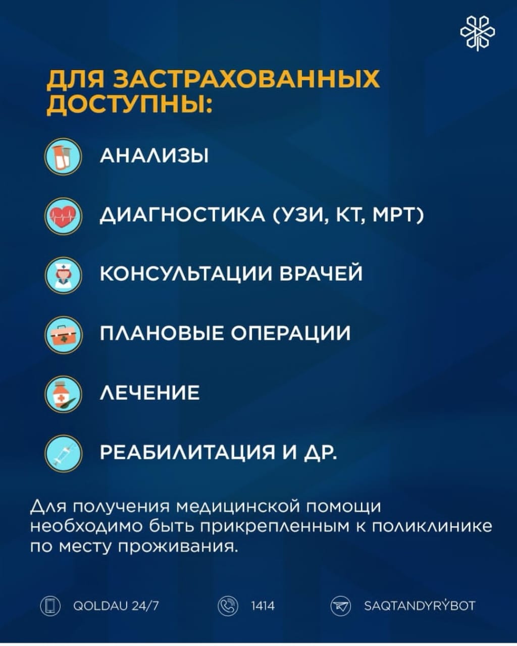 ❗Помните, что для застрахованных бесплатно доступны: диагностика, консультации врачей, плановые операции, лечение, реабилитация и др. Для получения медицинской помощи необходимо быть прикрепленным к поликлинике по месту проживания.
